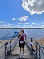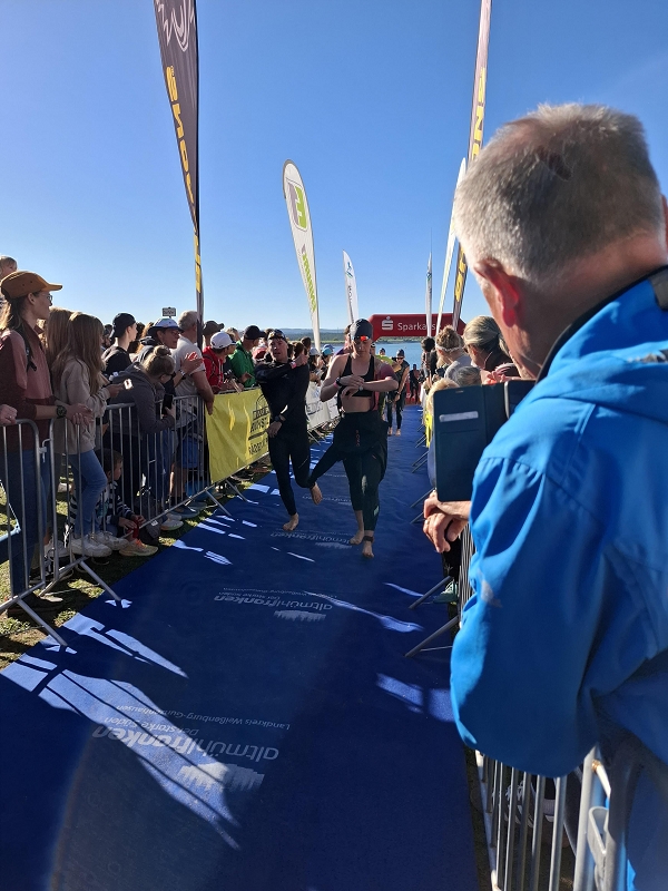 Die Laufstrecke führte über 21,1 Kilometer größtenteils entlang des Ufers vom großen zum kleinen Brombachsee und wieder zurück. Geplant war ein kontrollierter Longrun mit Endbeschleunigung, um die Beine für die kommenden Trainingseinheiten zu schonen. Die erste Hälfte des Halbmarathons absolvierte Sabrina im geplanten Tempo von 5:45–6:00 min/km. Doch zu Beginn der zweiten Hälfte änderte sich der Plan: Gemeinsam mit einem Athleten, der seine erste Mitteldistanz bestritt und unbedingt unter zwei Stunden laufen wollte, entwickelte sich ein spontanes Teamwork. Sabrina übernahm das Pacing und unterstützte ihn auf den letzten zehn Kilometern. Am Ende stand für sie selbst eine Laufzeit von 1:57:55 Stunden und eine Gesamtzeit von 5:31:23 Stunden. Besonders erfreulich: Auch ihr Begleiter Harald konnte dank der gemeinsamen Anstrengung sein Ziel erreichen.
