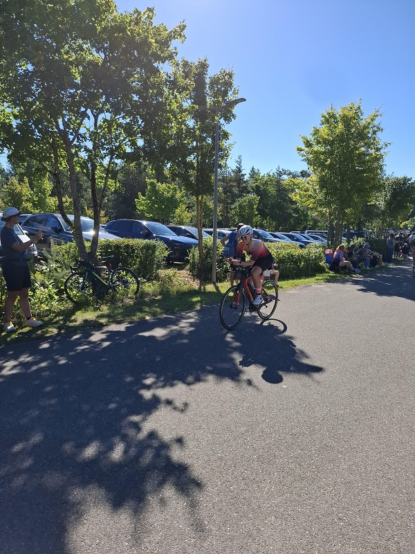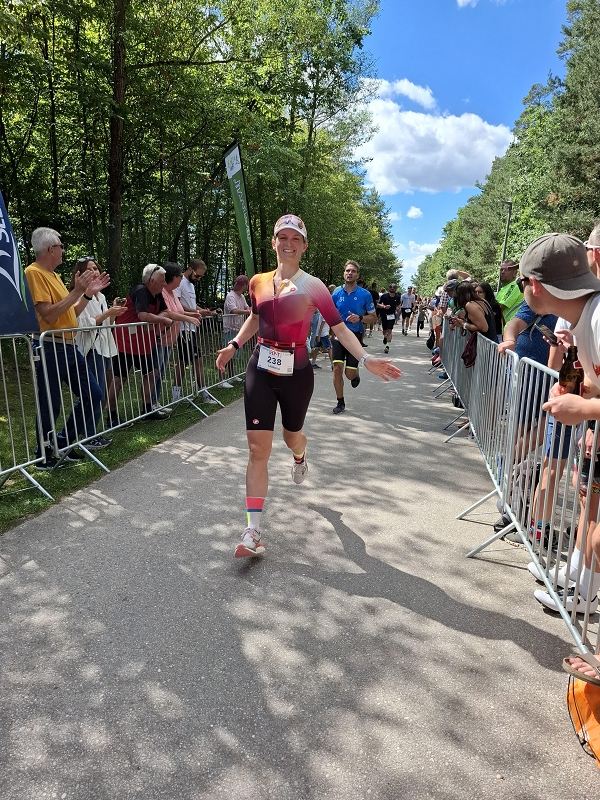 Pünktlich um 8:30 Uhr fiel bei perfektem Triathlon-Wetter der Startschuss im Rolling-Start-Verfahren. Nach einem soliden Schwimmen überquerte Sabrina nach 34 Minuten die erste Wechselzone und stieg aufs Rad. Dort warteten drei wellige Runden mit insgesamt 980 Höhenmetern. Trotz der guten Stimmung an der Strecke und des abwechslungsreichen Profils hielt sie sich diszipliniert zurück – mit einem konstanten Grinsen im Gesicht. Nach 2:50 Stunden war der Radsplit beendet und der zweite Teil des Rennens erfolgreich abgehakt.