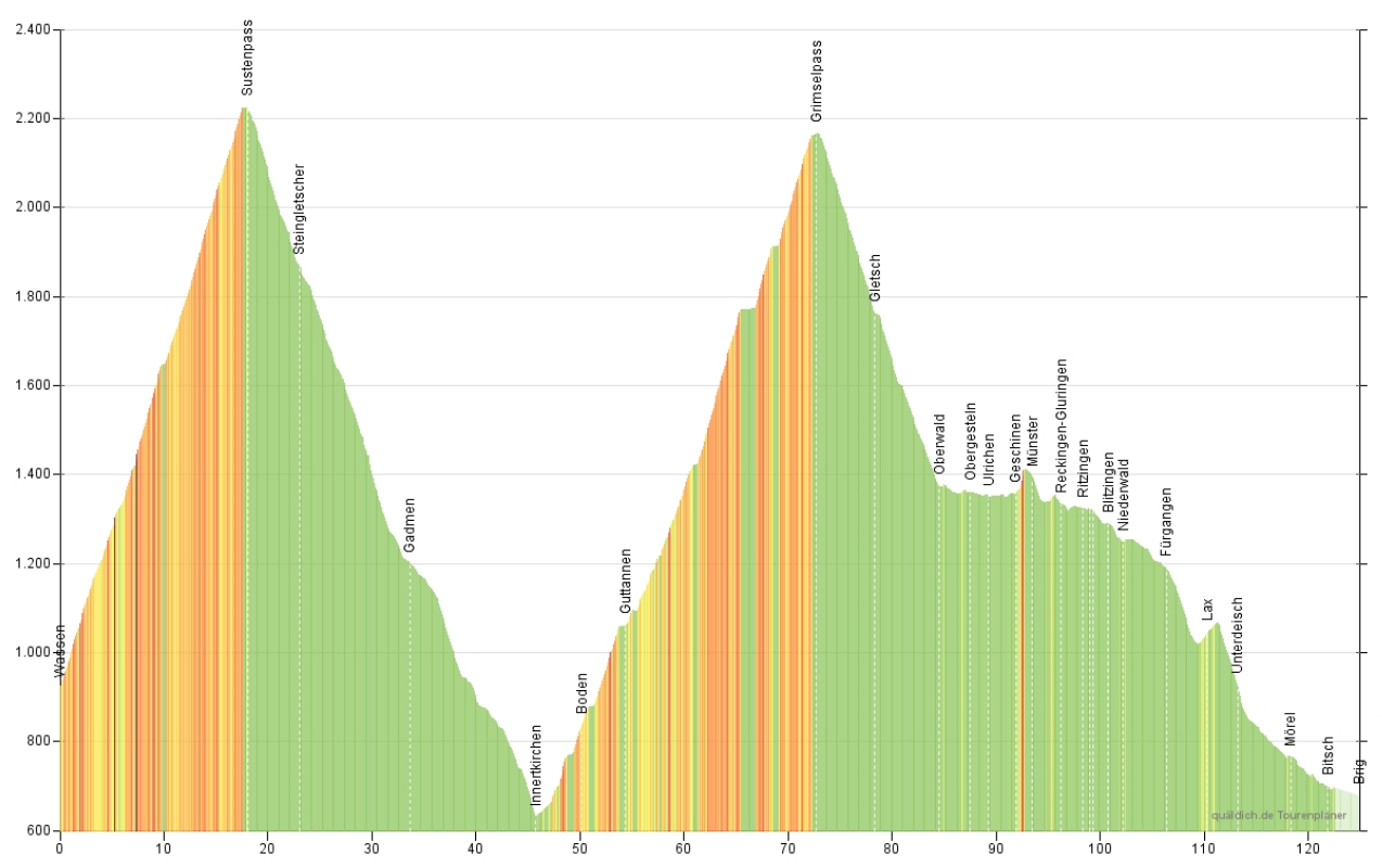 124,9 km, 3.090 Hm, Wassen - Sustenpass - Innertkirchen - Grimselpass - Gletsch - Oberwald - Brig