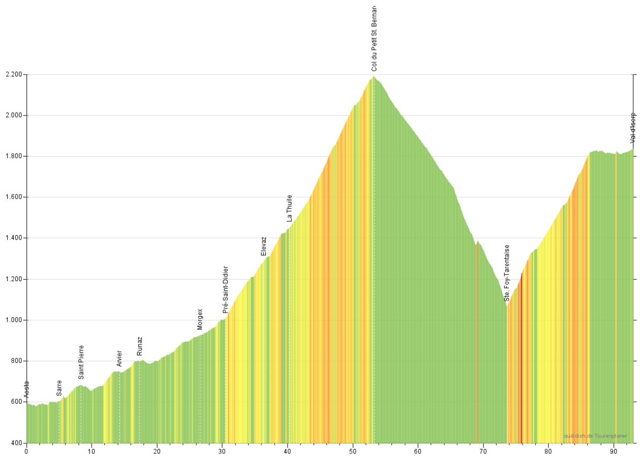 92,9 km, 2.588 Hm, Aosta - La Thuile - Col du Petit St. Bernard - Ste. Foy-Tarentaise - Val d'Isere