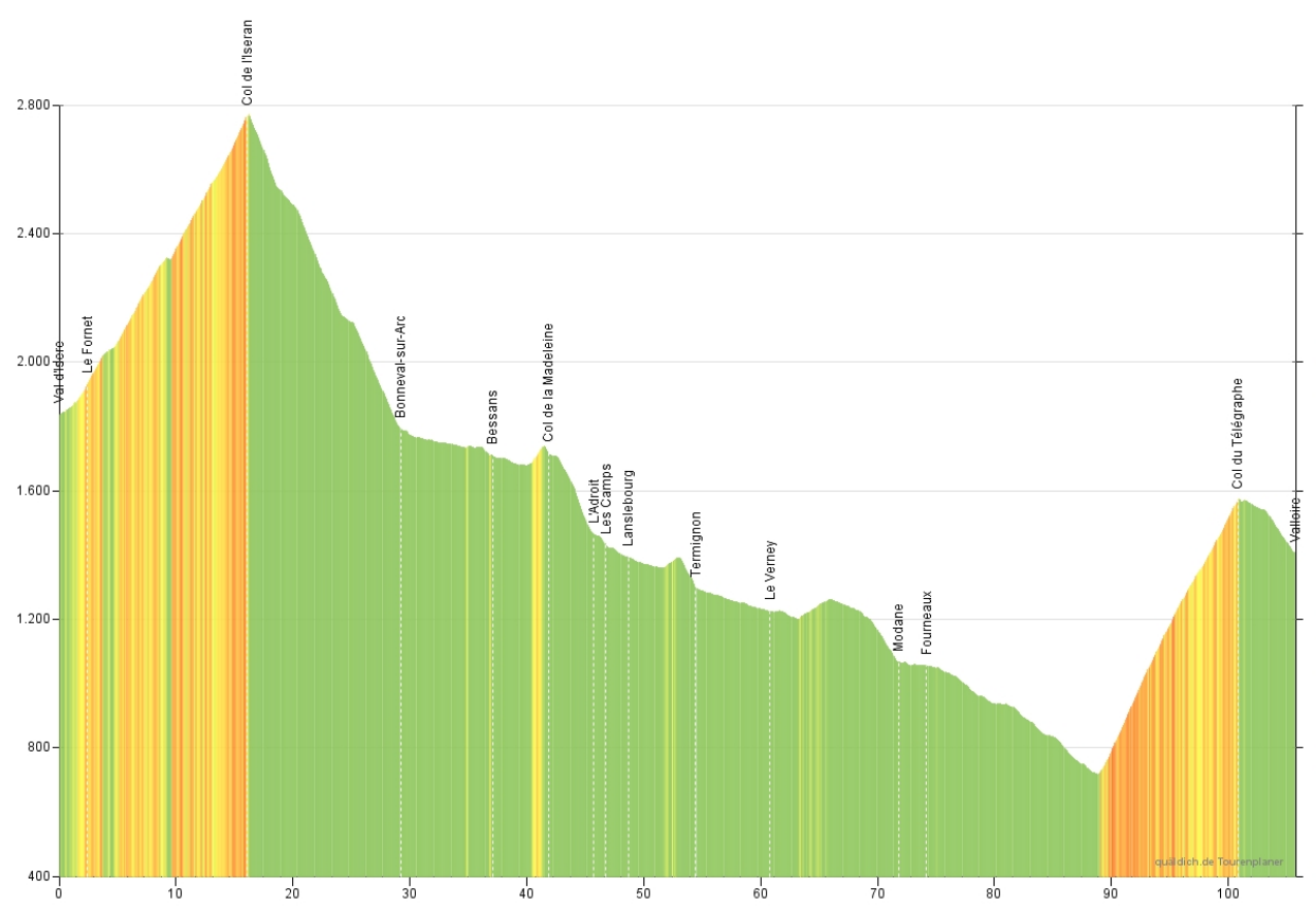 105,7 km, 2.025 Hm, Val d'Isere - Col de I'Iseran - Col de la Madelaine - Lanslebourg - Mondane - Col du Teleraphe - Valloire