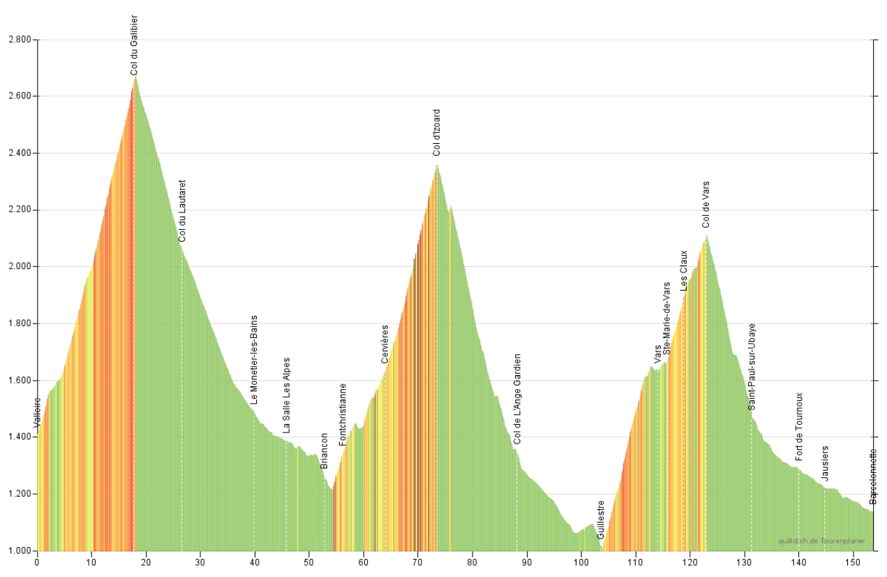 153,6 km, 3.771 Hm, Valloire - Col du Galibier - Col du Lautaret - Briancon - Col d'Izoard - Guillestre - Vars - Col de Vars - Jausiers - Barcelonnette