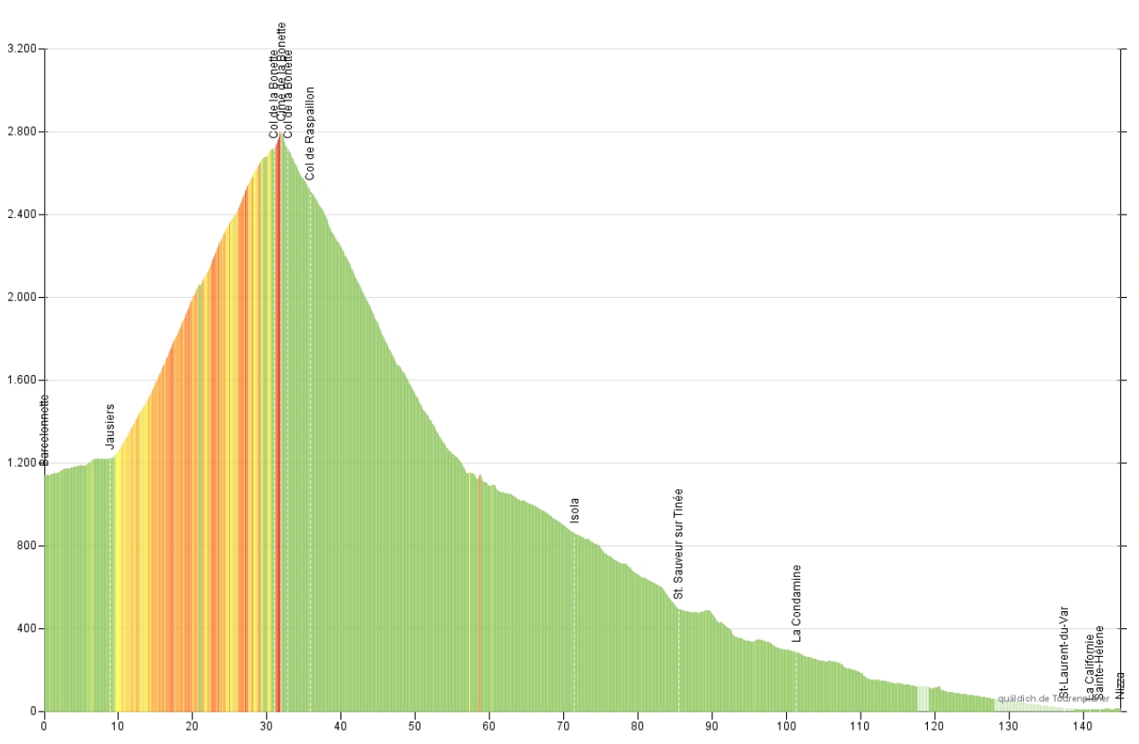 144,9 km, 1.813 Hm, Barcelonnette - Jausiers - Col de la Bonette - Isola - St. Sauveur sur Tinee - Nizza