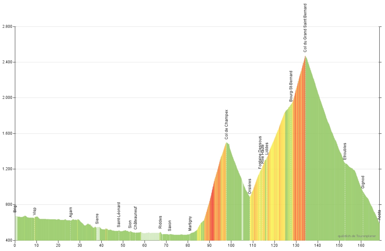 168,8 km, 2.909 Hm, Brig - Martigny - Col de Champex - Orsieres - Col du Grand Saint Bernard - Aosta