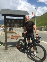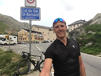 Bereits um 3:30 Uhr klingelte an diesem Morgen der Wecker. Zum Glück hatte sich mein lieber Vereinskollege Rudolf Badstuber bereit erklärt, mich nach Brig zu fahren - vielen Dank Rudi. Nach 5 Stunden Autofahrt ging es bei hochsommerlichen Temperaturen am Bahnhof von Brig aufs Fahrrad. Die ersten 80 km waren überwiegend flach und gemütlich zu fahren. Nach einem kurzen Mittagessen in Martigny ging es dann bergauf zum Col de Champex. Der Pass begann sehr steil und ich tat mir richtig schwer. Mittlerweile hatte es auch schon 34 Grad und die Luft stand. Es dauerte keine 20 Minuten bis meine gerade gefüllten Getränkeflaschen leer waren. Etwas dehydriert kam ich oben an. Erfreulicherweise befand sich auf Passhöhe ein Kiosk und ich konnte mein Flüssigkeitsdefizit etwas ausgleichen. Mit vollen Getränkeflaschen ging es dann 10 km bergab nach Orsieres wo der nächste Pass begann. Der Col du Grand Saint Bernard war nicht besonders steil und glich einer Autobahn. Breite, teilweisen zweispurige Straßen und starker Verkehr. Der hässlichste Pass den ich bis dato gesehen hatte. Erst nach 20 km, auf ca. 1900 m Höhe, trennte ein Tunnel den Fernverkehr von den Genussfahrern, so dass die Berge und die Natur wieder etwas in den Vordergrund rückten. Leider waren meine Getränkeflaschen an dieser Stelle schon wieder leer und auch die Müdigkeit machte mir langsam zu schaffen. Der restliche Weg bis zur 2473 m gelegenen Passhöhe war so eine richtige Quälerei. Nach einer schnellen Abfahrt nach Aosta war um 21 Uhr dann Schluss. An diesem Tag saß ich ca. 8 Stunden auf dem Rad und trank 15 l Wasser - unfassbar.