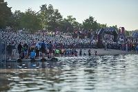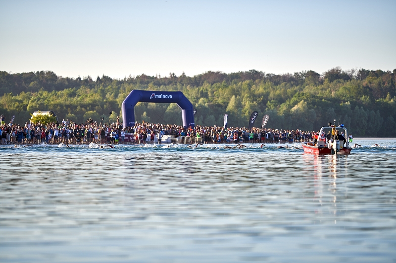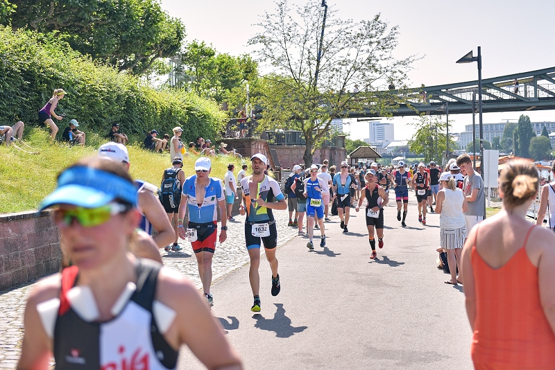 Entsprechend dem Wetter war auch die Wassertemperatur im Langener Waldsee, ca. 25,5 Grad. Dies bedeuete dann auch das beim Schwimmen kein Neoprenanzug getragen werden durfte. Um 06:25 Uhr fiel dann der Startschuss zur Mainova European Championsship 2019. Gestartet wurde in folgender Reihenfolge: 06:25 Uhr Start Profi-Athleten Männer 06:30 Uhr Start Profi-Athleten Frauen 06:40-07:00 Uhr Rolling Start der Altersklassen Athleten (unter anderem wir). Beim Rolling Start platzieren sich die Athleten anhand ihrer geschätzten Schwimmzeit im Vorstartbereich (schnelle Schwimmer vorne, gemächliche Schwimmer hinten). Alle 2 Sekunden werden 6 Athleten auf ihr IRONMAN -Abenteuer geschickt. Philipp ordnete sich bei 01:00 bis 01:10 Stunden und Simon bei 01:10 bis 01:20 Stunden ein. Aufgrund der zu dieser Zeit noch tief stehenden Sonne waren die Abschnitte Richtung Osten schwierig zu schwimmen, was z.B. bei Simon dazu führte das er anstatt der eigentlichen 3,8km ca. 4,1km auf seinem Konto stehen hatte. Philipp hatte bereits beim Schwimmen mit Krämpfen zu kämpfen und konnte auch deshalb seine angestrebte Zeit nicht erreichen. Nach 01:14:30 Stunden kam Philipp und nach 01:16:05 Stunden kam Simon aus dem Wasser.