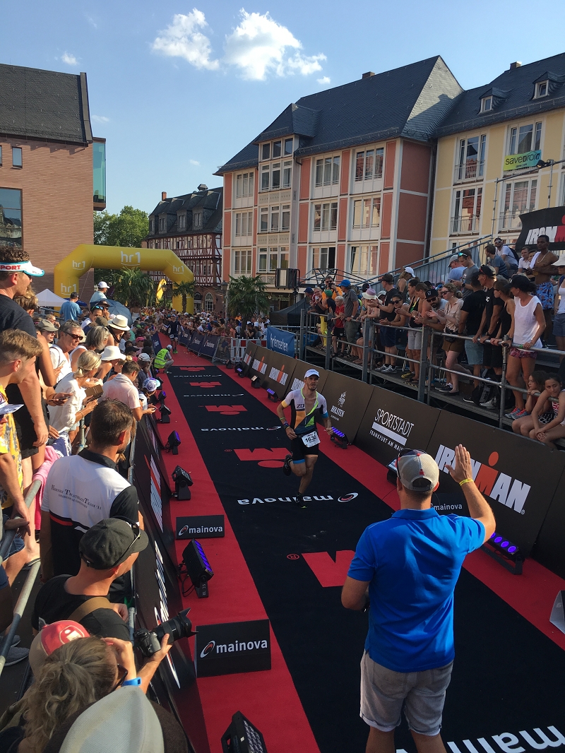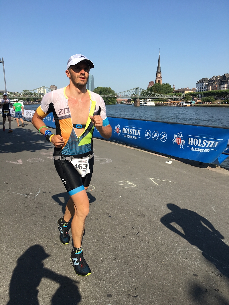 Der abschließende Marathon wurde bei den nun vorherrschenden 38 Grad eine echte Willensprobe. Gelaufen werden mussten 4 Runden am Main entlang. Mit bereits gedrosseltem Tempo starte Simon auf die Laufstrecke, die bevorstehenden Strapazen im Kopf. Bis auf eine kurze "Wanderung" anfangs der letzten Laufrunde konnte er den Marathon dann auch durchlaufen. Nach 11:42:34 Stunden erreichte er überglücklich das Ziel am Frankfurter Römer. Damit erreichte er Rang 117 in der Altersklasse 35-39 und Rang 621 von 2.064 Finishern.
