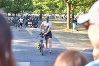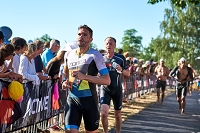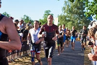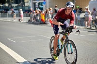 Anschließend ging es auf die 185km lange Radstrecke (ca. 1.450 Hohenmeter). Die Strecke führte vom südlich von Frankfurt gelegen Waldsee durch die Stadt. Nördlich der Stadt mussten zwei Runden gefahren werden. Die erste Runde war aufgrund der immer noch "milden" Temperaturen und noch frischen Beinen schnell zurückgelegt und stellte auch noch keine allzu großen Probleme dar. Auf der zweiten Runde stieg die Temperatur jedoch rasch an und mit ihr auch der Wind. Folglich nahm die Geschwindigkeit bei uns beiden auch enorm ab. Die Verpflegungsstellen mussten ausgiebig genutzt werden um die Speicher wieder aufzufüllen und den Körper mit einer Wasserdusche wieder etwas herunter zu kühlen. Leider nicht ausreichend für Philipp, er musste das Rennen nach dem Radfahren beenden. Simon kam mit den Bedingungen "etwas" besser klar und beendete das Radfahren nach 06:02:05 Stunden.