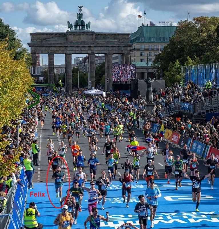Der Start von Felix stand nach einer trainingsfreien und erkältungsreichen Woche noch auf wackeligen Beinen. Er war aber trotzdem perfekt vorbereitet und stand am Sonntag hochmotiviert an der Startlinie. Die perfekten Bedingungen und die wohl besten Zuschauer, die er in seiner kurzen Marathon-Karriere gesehen hat, sorgten dafür, dass er seine persönliche Bestzeit um mehr als 5 Minuten verbessern konnte. Nach 03:14:28 Stunden erreichte er glücklich, aber sichtlich erschöpft, die Ziellinie.